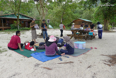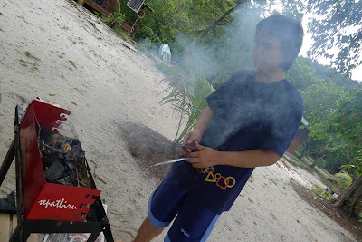 ok, dah sampai pulau, CANTIK,!! tapi banyak obor-obor wuuuu... sampai jer start prepare utk bbq and sandwich and aku ngantuk..tdo sat dalam kemah, diorang kejut ayam dah masak..huk3