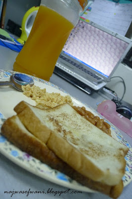 Pagi-pagi lagi lepas smayang subuh ak dah masuk dpur buat breakfast. yeahhh, smngt gitu...sebab ak memang kurang rajin nak turun bawah pastu panjat tangga sampai level 5 balik semata-mata nak beli breakfast. tidak sangat lagi-lagi waktu pagi. geledah peti sejuk jumpe red bean, buttercup and telur beli aritu ade lagi and inilah hasilnye. roti bakar, red bean and scrambled egg. plus minum orange twister..berkhasiat skali breakfastku arini. hehehe
